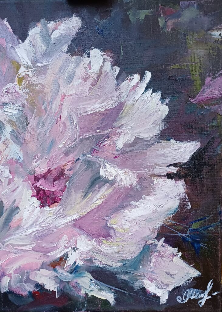 I started to paint again in May 2022 when she was passing through Germany and spent there 4 days. I was invited to my friend’s Art Class. My “Art update” during that period included 1 Watercolour, 1 Acrylic and 1 Oil. I tried and discovered acrylic and oil for the first time, enjoying the new textures and effects. Pretty Iris from my friend’s garden was captured before the heavy rain that knocked the plants. Original available with Passep Artouts White for Frame size 24,5x19cm