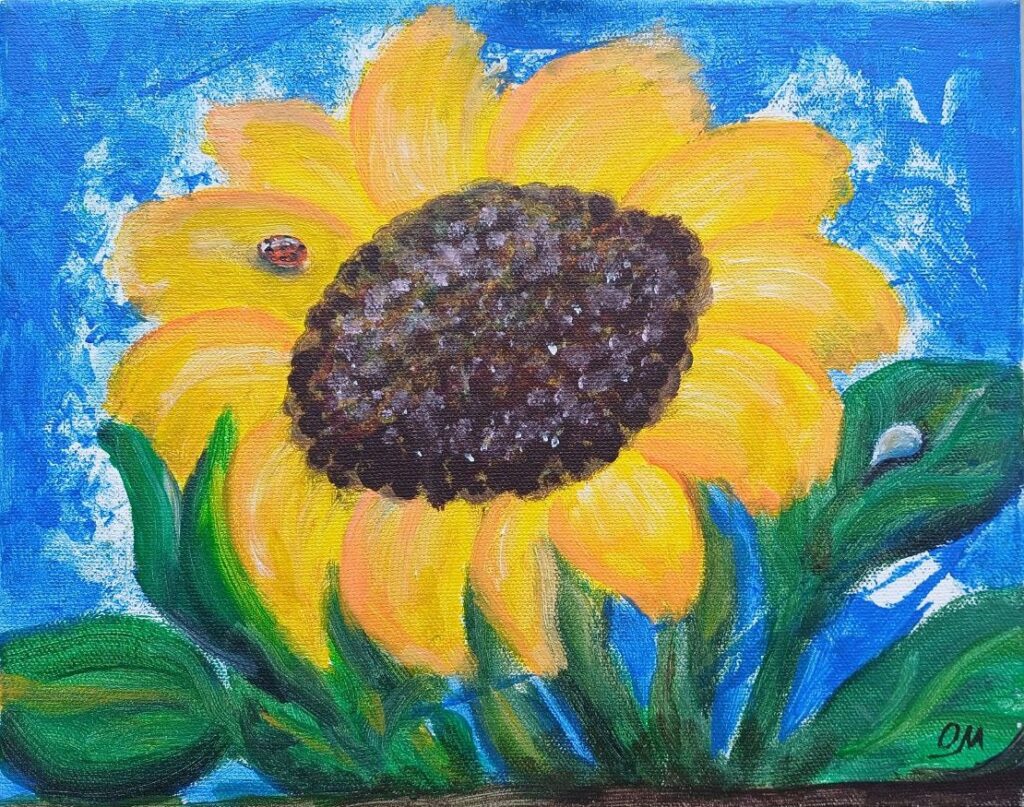 I was forced to flee the “Russian world” from Nova Kakhovka (my city). I had been passing through Julia’s place in Germany and spent here 4 amazing days. I was invited to her Art class. Julia is my school friend. She has been living in Germany for a long time.  Julia was able to pick up her mother and friends from Georgia when they left our city through Crimea.  Our city is still under occupation from the first day of the war… lt was my first acrylic work and it was nice to hear words of support for Ukraine from Julia’s students, but it wasn’t like that everywhere, unfortunately…